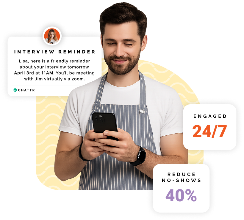 Keep your candidates engaged 24/7 to reduce no-shows by 40%. Answer pay or shift-related questions, send reminders before interviews, and enable seamless onboarding.